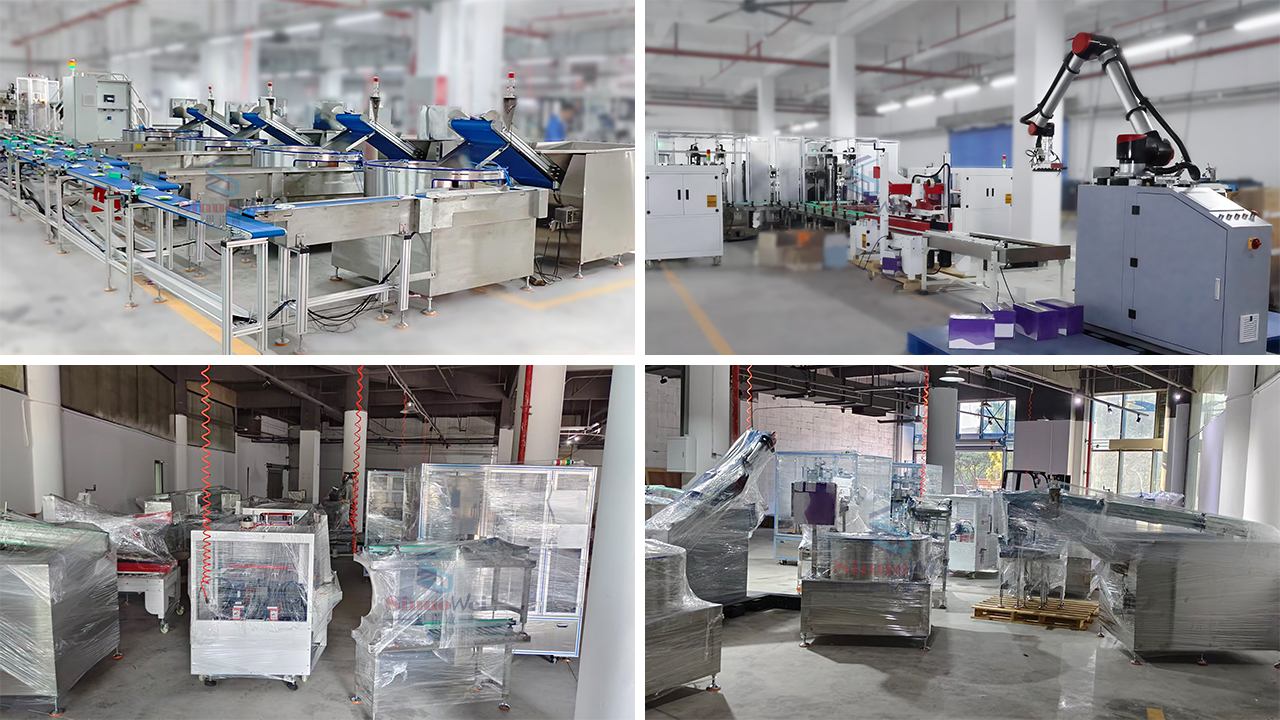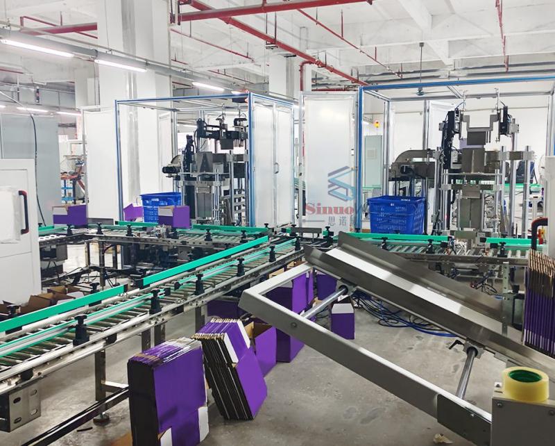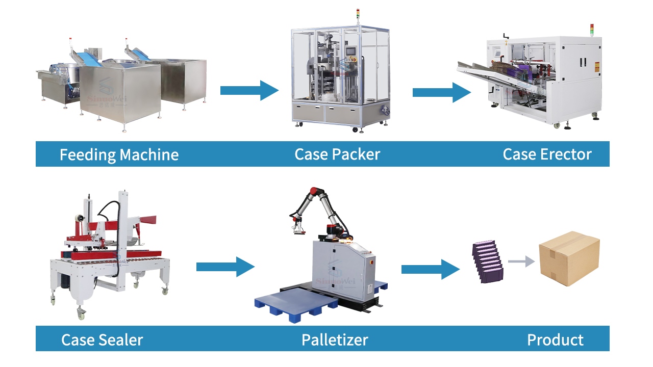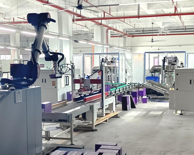 The Automatic Food Packaging Line can achieve full-process automation from bagged products to boxing and palletizing. Operators only need to pour the food products into the feed tray, and the equipment will automatically complete tasks such as material alignment, boxing, sealing, and palletizing. This significantly enhances production efficiency, reduces labor costs, and ensures a high-speed, stable, and standardized packaging process.